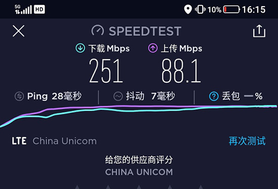 我們選用專業(yè)網速測試軟件,選用默認連接節(jié)點,測試5G網絡條件下海信5G手機F50+的傳輸速度。實測其在5G網絡下可以達到下行251Mbps,上行88.1Mbps,抖動28ms的水準。