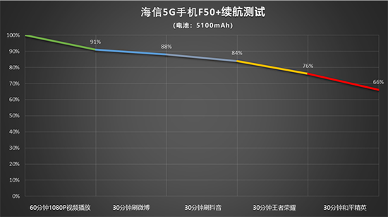 具體續(xù)航測試結(jié)果如上圖,經(jīng)過3個小時連續(xù)續(xù)航測試后,海信5G手機F50+仍舊能夠剩余66%的電量,實際表現(xiàn)較為出色,即使在5G網(wǎng)絡(luò)下使用也不用太擔心。