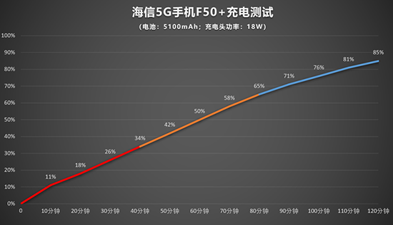 海信5G手機F50+內(nèi)置了5100mAh超大電池,與之搭配的為18W充電,充電續(xù)航部分我們都進行了實測。續(xù)航部分,我們連續(xù)進行了3個小時的測試,包括在線看1080P視頻、刷微博、抖音、玩游戲等日常使用場景,在電量100%的時候開始續(xù)航測試。