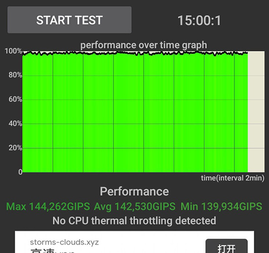 為了測(cè)試海信5G手機(jī)F50+的性能穩(wěn)定性表現(xiàn),我們使用CPU Throttling Test進(jìn)行了CPU拷機(jī),看一看海信5G手機(jī)F50+的極限算力表現(xiàn)。在15分鐘的測(cè)試過程中,虎賁T7510 5G芯片的CPU沒有發(fā)檢測(cè)到頻率波動(dòng),也就是說發(fā)揮出100%的極限算力,強(qiáng)勢(shì)保持最高主頻。這在迄今為止筆者測(cè)試過的千元機(jī)型中還屬首次。