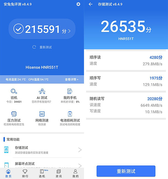 我們使用安兔兔進(jìn)行綜合跑分和存儲(chǔ)測(cè)試。綜合跑分方面,海信5G手機(jī)F50+得分215591分。存儲(chǔ)測(cè)試方面,海信5G手機(jī)F50+測(cè)出的順序讀寫速度分別為279.8MB/s和129.1MB/s,隨機(jī)讀寫速度分別為6649.4MB/s和10.1MB/s。