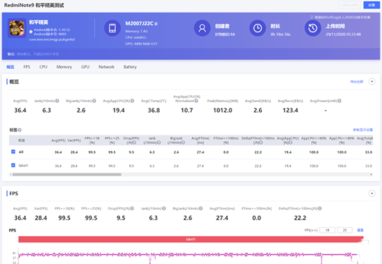 《和平精英》游戲中最優(yōu)的配置只能開到高清+高幀率,而流暢畫質(zhì)則支持超高幀率模式,以上為一盤游戲下來的FPS數(shù)據(jù),通過上表的數(shù)據(jù)可以看出,Redmi Note 9在開始超高幀率后,幀率平均維持在36. 4幀,每個(gè)時(shí)刻的幀率幾乎在同一條直線上,所以Redmi Note 9針對(duì)《和平精英》游戲的流暢體驗(yàn)還算沒有多大問題的,如果不追求旗艦的超流暢,Redmi Note 9的體驗(yàn)上還是能駕馭的。