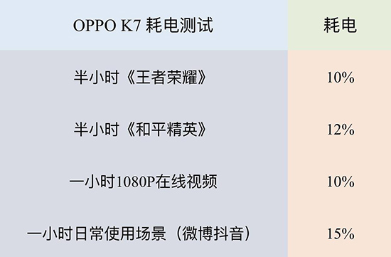 OPPO K7配備了一塊4025mAh容量的電池,老實(shí)說(shuō)并不算大,但考慮到180g的輕薄機(jī)身,我對(duì)它的續(xù)航表現(xiàn)還是比較期待的。在連接WiFi的情況下(已插5G卡),半個(gè)小時(shí)的《王者榮耀》和半個(gè)小時(shí)的《和平精英》分別耗電10%和12%;一小時(shí)1080P在線視頻和一小時(shí)的微博抖音分別耗電10%和15%。PS:《王者榮耀》和《和平精英》均為可開最高畫質(zhì)。