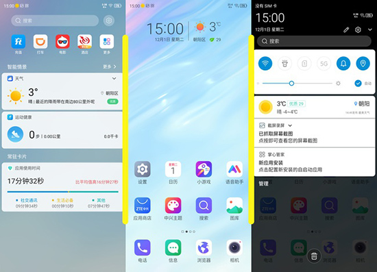 從主屏幕就能看出,MiFavor 10大幅增加了界面中的留白比例,各元素之間的間隔也更舒展,不會(huì)讓人有擁擠的感覺。負(fù)一屏將運(yùn)動(dòng)健康和使用時(shí)間等數(shù)據(jù)以卡片的形式整合展示,更直觀高效,同時(shí)這里卡片“智能情景”的命名似乎也在暗示未來將會(huì)成為中興自家智能生態(tài)的一個(gè)便捷入口。