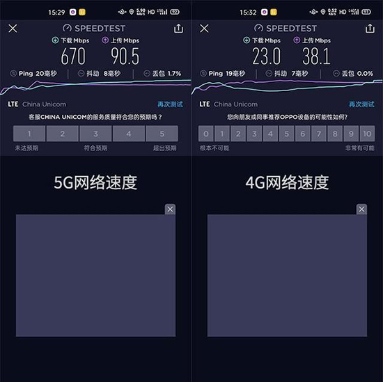 我們選用Speedtest,選用同一連接節(jié)點(diǎn),分別測試5G網(wǎng)絡(luò)和4G網(wǎng)絡(luò)條件下OPPO A92s的傳輸速度。實(shí)測OPPO A92s在5G網(wǎng)絡(luò)下可以達(dá)到下行670Mbps,上行90.5Mbps,抖動(dòng)8ms的水準(zhǔn),在4G網(wǎng)絡(luò)下可以達(dá)到下行23Mbps,上行38.1Mbps,抖動(dòng)7ms的水準(zhǔn),速度差別相當(dāng)巨大。