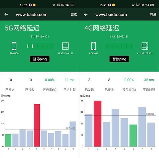 隨后,我們打開Wi-Fi魔盒,測試在5G網(wǎng)絡(luò)和4G網(wǎng)絡(luò)下訪問百度時(shí)的延遲。5G網(wǎng)絡(luò)下,OPPO A92s最高延遲27.80ms,最低延遲8.11ms,平均延遲11ms。4G網(wǎng)絡(luò)下,OPPO A92s最高延遲51.40ms,最低延遲24.70ms,平均延遲35ms。由此可見,5G網(wǎng)絡(luò)的低延遲優(yōu)勢非常明顯。