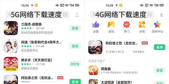 最后,我們分別使用5G網(wǎng)絡(luò)和4G網(wǎng)絡(luò)在應(yīng)用商店下載同一大型游戲,打開網(wǎng)速監(jiān)控,可以看到,5G網(wǎng)絡(luò)下載的速度約為55.4MB/S,4G網(wǎng)絡(luò)則為734KB/S。