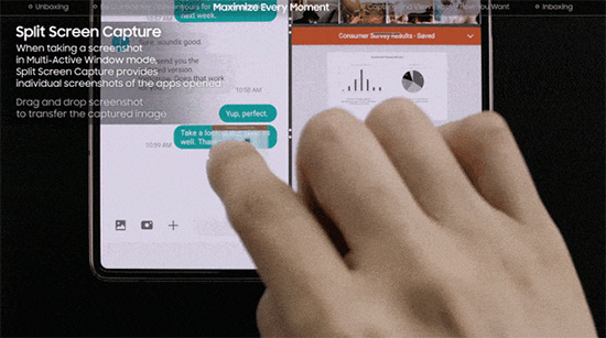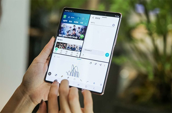 除此之外,三星Galaxy Z Fold2 5G的高效率還體現在對文件的處理方式上。日常生活,當你需要把照片發(fā)給朋友時,需要按照菜單索引一步步去提取發(fā)送,但三星Galaxy Z Fold2 5G支持文件拖曳功能,可以把文檔、圖片等文件直接拖曳到聊天框中,即刻完成發(fā)送。
