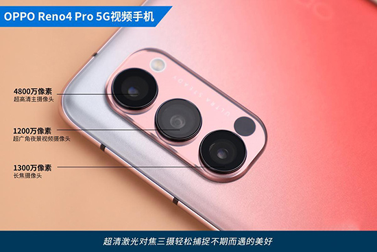 OPPO Reno4 Pro 5G手機可以說是新晉“實力小生”,其搭載的是由4800萬像素超高清主攝像頭(f/1.7光圈)、1200萬像素超廣角夜景視頻攝像頭(f/2.2光圈)、1300萬像素長焦攝像頭(f/2.4光圈)組成的超清激光對焦三攝,能夠輕松捕捉不期而遇的美好。