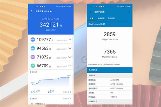 OPPO Reno4 Pro搭載了高通驍龍765G處理器,這是一顆與高通驍龍865同樣采用7nm工藝的處理器。使用安兔兔跑分,OPPO Reno4 Pro獲得了342121分?jǐn)?shù),整體表現(xiàn)不錯(cuò)。使用Geekbench 4進(jìn)行測(cè)試,OPPO Reno4 Pro單核得分2859,多核得分為7365,總體符合性能期望。