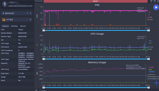 高通驍龍765G等一眾中端芯片雖然性能尚可,但由于定位所致在《和平精英》等游戲中無法開啟60幀幀率,想要體驗(yàn)只能借助破解。在破解之后高通驍龍765G應(yīng)付60fps游戲還是沒有問題的,在接近30分鐘的游戲里保持60fps運(yùn)行問題不大,而手機(jī)本身也只是微微發(fā)熱,不影響體驗(yàn)。