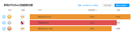 對(duì)比來看,就Geekbench 5所反映的CPU表現(xiàn)來看,聯(lián)想樂檬K12 Pro所搭載的驍龍662的單核心與聯(lián)發(fā)科Helio G80尚存在一定差距,相當(dāng)于天璣720的61%;多核心基本與Helio G80相當(dāng),相當(dāng)于天璣720的86%。