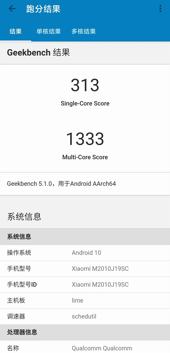 在Geekbench 5的評價體系當中,Redmi Note 9 4G所搭載的驍龍662單核得分為313,多核得分為1333。