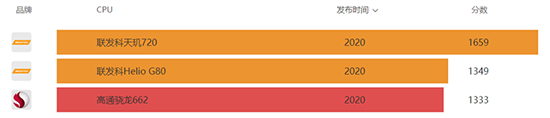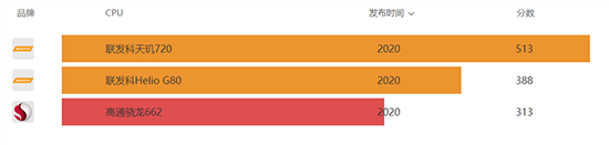 對比來看,就Geekbench 5所反映的CPU表現(xiàn)來看,驍龍662的單核心與聯(lián)發(fā)科Helio G80尚存在一定差距,相當于天璣720的61%;多核心則與Helio G80相近,相當于天璣720的80%。