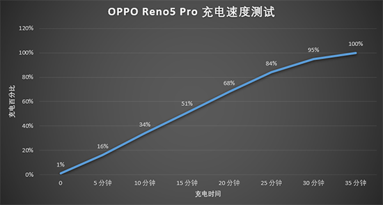 有意思的是,同樣65W閃充,之前4000mAh電池Reno4 Pro充至100%耗時(shí)也是35分鐘。換句話說,雖然電池容量有所提升,但由于Reno5Pro的雙電芯新增了極耳中置,阻抗和發(fā)熱更小,充電速度更快,所以整體充電耗時(shí)并沒有因?yàn)殡姵厝萘吭黾佣兴娱L。