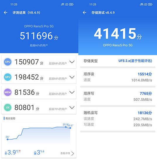 OPPO Reno5 Pro的安兔兔評(píng)測(cè)跑分測(cè)試得分超過(guò)51萬(wàn)分,通過(guò)各子項(xiàng)的得分可以看到圖形方面的分?jǐn)?shù)很高,正符合當(dāng)下手機(jī)的性能需求。在存儲(chǔ)測(cè)試中總得分超過(guò)41000分,順序讀取速度超過(guò)1000MB/s,順序?qū)懭胨俣冗_(dá)到了500MB/s級(jí)別,在UFS 2.1閃存中的速度表現(xiàn)十分驚人。
