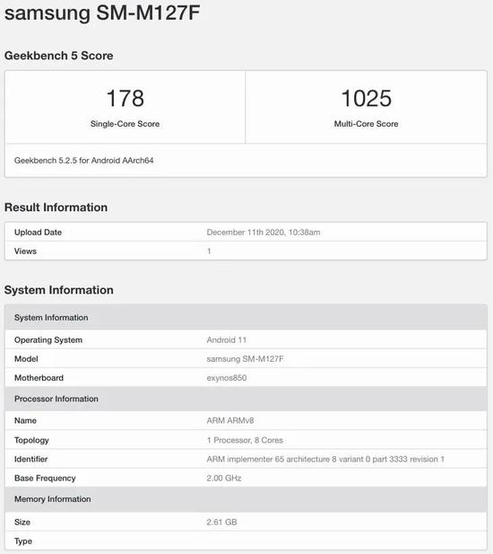 根據Geekbench信息,三星Galaxy M12(型號SM-M127F)搭載自家Exynos 850芯片,輔以3GB運存,出廠運行基于Android11的操作系統,Exynos 850單核成績?yōu)?78分,多核成績?yōu)?025分。