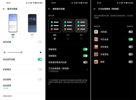 除了優(yōu)秀的屏幕顯示素質(zhì),Reno5 Pro還支持暗色模式和護(hù)眼模式,在暗色模式下,你可以選擇不同程度的暗色效果。暗色模式下,系統(tǒng)默認(rèn)會調(diào)暗壁紙、圖標(biāo),與整體暗色效果更搭配。系統(tǒng)支持第三方應(yīng)用暗色,所適配的第三方應(yīng)用可以直接開啟暗色模式。