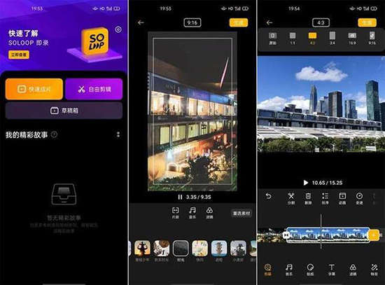 拍攝完成后,我們還可以通過內(nèi)置Soloop即錄APP可以實(shí)現(xiàn)視頻快速剪輯,支持智能成片,只需選擇素材即可快速生成一段效果不錯(cuò)的影片。當(dāng)然你也可以進(jìn)行手動(dòng)剪輯,加入不同的特效、濾鏡、轉(zhuǎn)場動(dòng)畫等,軟件的整體操作對用戶很友好,即使是新手也能快速完成視頻剪輯,上手簡單。