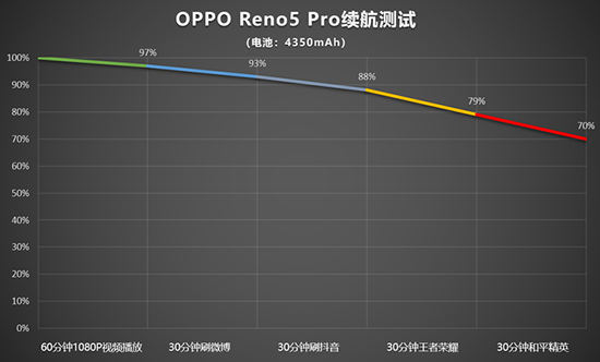 測試結(jié)果如下圖,連接WiFi,使用Reno5 Pro在線觀看一小時1080P視頻耗電3%,30分鐘微博耗電4%,30分鐘抖音耗電5%,30分鐘王者耗電9%,30分鐘和平精英耗電9%。最終剩余電量仍有70%!在4350mAh大電池的加持下,Reno5 Pro有著相當(dāng)不錯的續(xù)航表現(xiàn),預(yù)計重度使用8小時到下班也是妥妥夠用的。