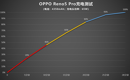 除了續(xù)航超長以外,Reno5 Pro還配備了65W超級閃充,在手機耗盡電量自動關(guān)機后開始充電測試,15分鐘就能達(dá)到66%的電量,僅28分鐘就已經(jīng)達(dá)到100%的電量,充電速度非??欤梢悦黠@改變用戶的充電體驗,縮短等待時間。