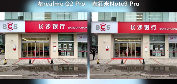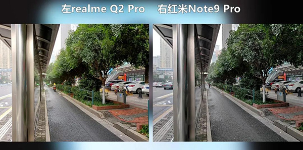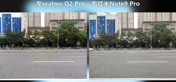 我們拿它拍了一些樣張,白天場景表現(xiàn)比較穩(wěn)定,現(xiàn)階段成像風(fēng)格偏真實(shí)素雅,在和realme Q2 Pro對比的時候,觀感上略微吃虧,比如說我們放的這幾組對比樣張,拍攝時天氣和空氣質(zhì)量都比較差,所以紅米Note9 Pro拍出來就是霧蒙蒙的,但是realme Q2 Pro就自帶去霧霾效果,畫面色彩更鮮艷,對比度也更高。