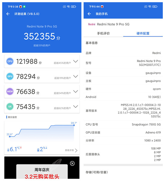 跑了幾次,分?jǐn)?shù)均在35萬分以上。與同價位的入門機處理器和跑分結(jié)果對比來看, Redmi Note 9 Pro的綜合優(yōu)勢還是很明顯的。當(dāng)然了,它的散熱也是非常的出色。它整機采用11顆溫度傳感器,可以精確感知熱源,智能匹配散熱方案。立體液冷散熱系統(tǒng)覆蓋主要發(fā)熱原件,可以快導(dǎo)熱。