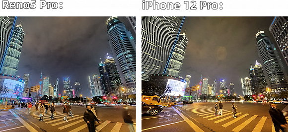 夜景上,我所拍攝的環(huán)境比較偏黃,iPhone還原了這個(gè)色彩,但還是出現(xiàn)了“鬼影”的老毛病,而OPPO就更加清澈通透一點(diǎn)。