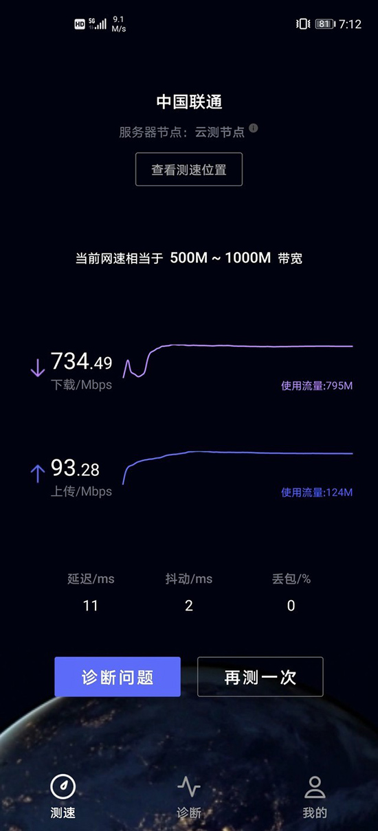 使用華為官方出品的“一鍵測速”(在華為應(yīng)用商城搜索“一鍵測速”,即可下載使用),5G速率實測結(jié)果為:下載速率為734.49Mbps,上傳速率達到了93.28Mbps,這個成績符合聯(lián)通5G套餐的網(wǎng)速。而這樣的5G網(wǎng)絡(luò)速度是大幅度優(yōu)于4G網(wǎng)絡(luò)的。