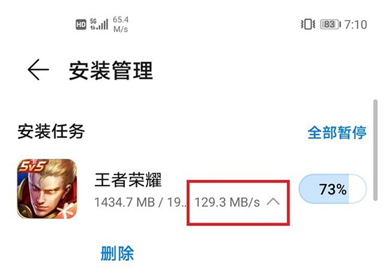 5G網(wǎng)絡(luò)環(huán)境下,華為Mate40的5G軟件下載速度表現(xiàn)也是極為優(yōu)秀的,下載峰值速率可達到129.3MB/s左右,《王者榮耀》在短時間內(nèi)下載完成。