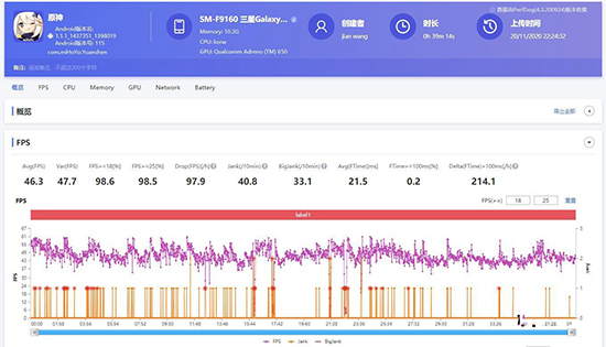 采用了極限畫質(zhì)對三星一加8T進行實測,通過Perfdog幀率測試軟件對游戲?qū)崟r幀率進行記錄。對比機型分別是采用高通驍龍865+的三星Galayx Z Fold2 5G、采用A14處理器蘋果iPhone 12、采用麒麟9000的華為Mate40 Pro。