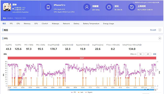 iPhone 12進行了20分鐘的實際測試,在日常任務(wù)的過程中平均幀率43.3fps,平均每10分鐘卡頓次數(shù)為32.3,平均每10分鐘嚴重卡頓次數(shù)15.9。握持狀態(tài)的游戲運行時溫度也明顯增高,對于愛玩兒高階游戲的人來說不是特別友好。