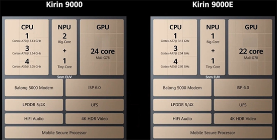 GPU方面為22核心的Mali-G78GPU,比麒麟9000少了兩顆,NPU方面為1大核+1小核,大核比麒麟9000少了一枚。其余方面保持不變,雖然后綴帶「E」,但實際上麒麟9000和麒麟9000E的規(guī)格差距非常小,這種差距在日常使用中基本感知不到。