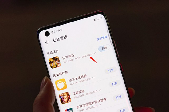 通過自帶華為商店,下載《和平精英》速度大概在30~50MB/s,換算下帶寬差不多400Mbps左右。