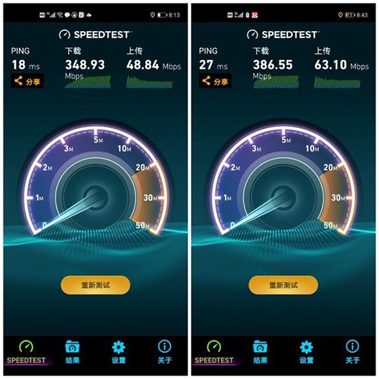 在筆者家中WiFi的環(huán)境下,測試網(wǎng)速下行為348Mbps,上行為48Mbps;而將網(wǎng)絡(luò)換成5G,測試網(wǎng)速下行為386Mbps,上行為63Mbps。這還是在我家這邊的5G環(huán)境不太穩(wěn)定的狀況下測試的,但不可置否的是華為Mate40的5G網(wǎng)速已經(jīng)穩(wěn)穩(wěn)超越了我家的電信300Mbps的光釬。