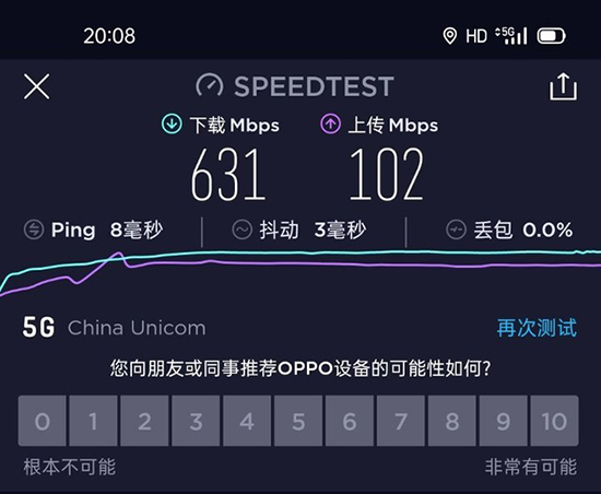 可以看到,OPPO A53的下行5G速率達(dá)到了631Mbps/s,上行速率達(dá)到了102Mbps/s。坦白講,這個(gè)分?jǐn)?shù)雖然符合5G網(wǎng)速的預(yù)期表現(xiàn),但并不能體現(xiàn)天璣720的最高5G速率水平。不難發(fā)現(xiàn),在測(cè)試過程,OPPO A53僅有8ms的ping延遲和3ms抖動(dòng),這意味它還有更高的潛力可供挖掘,但受限于運(yùn)營(yíng)商套餐設(shè)定,才難以跑出極速。不過即便如此,OPPO A53的成績(jī)也超過了不少在同一地點(diǎn)測(cè)試過的其他5G手機(jī),5G性能可見一斑。