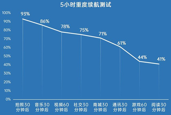 無(wú)論是5G也好,還是高刷屏幕也好,都是不折不扣的耗電大戶,續(xù)航自然也就成了用戶普遍關(guān)心的問(wèn)題。別看OPPO A53十分輕薄,機(jī)身厚度只有7.9mm,但依舊塞下了一塊4040mAh的大電池,這讓其續(xù)航能力有了質(zhì)的保證。按照慣例,這里我們依舊對(duì)100%電量的OPPO A53進(jìn)行了5小時(shí)重度用機(jī)測(cè)試,其測(cè)試結(jié)果如下: