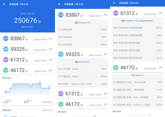 雖然OPPO A53 5G是千元價(jià)位的手機(jī),但它配備的天璣720處理器并不弱,4GB的運(yùn)行內(nèi)存在日常使用中并沒有感覺到卡頓,在游戲?qū)崪y之前,先按慣例跑個(gè)分。