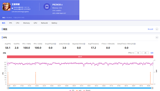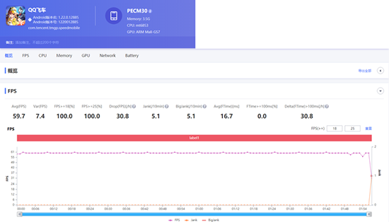 最后兩款則是王者榮耀和QQ飛車,開啟極高特效后,A53 5G運(yùn)行王者榮耀達(dá)到了58.1的平均幀數(shù)、QQ飛車平均值達(dá)到59.7,這些競技類游戲最重要的就是幀數(shù)的穩(wěn)定,如果有太大的卡頓則會(huì)影響玩家的手感和發(fā)揮。