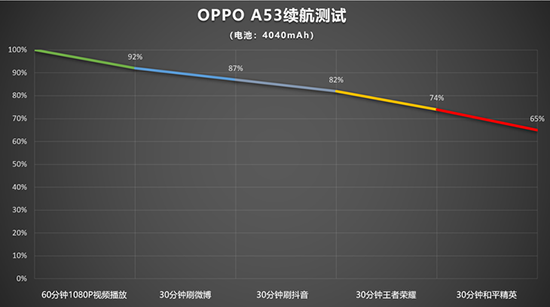 OPPO A53內(nèi)置4040mAh電池,支持10W充電,這部分我們也按照日常使用場(chǎng)景進(jìn)行測(cè)試。續(xù)航部分包括在線看1080P視頻、刷微博、抖音,玩游戲環(huán)節(jié),屏幕亮度保持在50%。