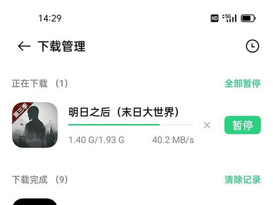 OPPO Reno5支持SA和NSA兩種模式,支持的5g頻段為n1/n3/n41/n77/n78。我們在室外用測試軟件測試了Reno5的5G速度(聯(lián)通),然后順便下載了一個接近2GB的游戲,結(jié)果如下: