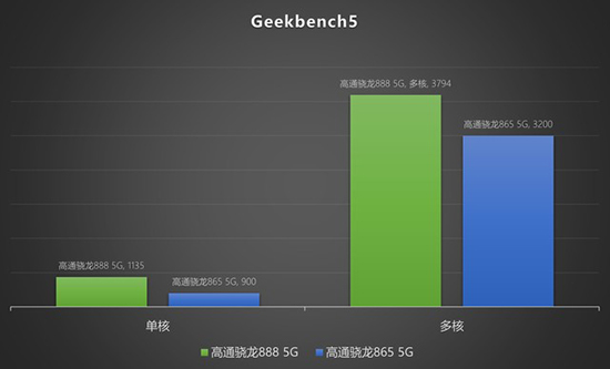 Geekbench5是一個被廣泛使用的跨平臺CPU測試基準(zhǔn)。此前搭載高通驍龍865 5G的旗艦們在Geekbench5取得的分?jǐn)?shù)通常在單核900分、多核3200分的水平上(數(shù)據(jù)源于Geekbench官網(wǎng))。相比之下,高通驍龍888 5G取得了單核1135、多核3794分的成績,提升非常明顯。