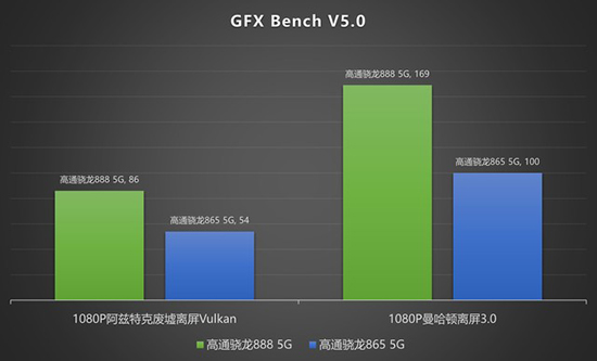 GFX Bench是一個專門測試GPU的跑分基準(zhǔn),對游戲性能有要求的用戶可以重點注意這一項。本次高通驍龍公布的跑分包括了1080P阿茲特克廢墟離屏Vulkan和1080P曼哈頓離屏3.0這兩項,分別測試了驍龍888 5G在Vulkan 1.0和OpenGL ES3.0這兩個圖形API下的性能。
