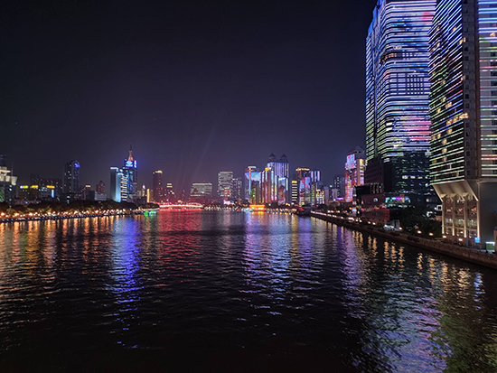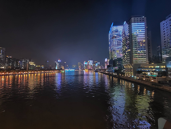如下圖,在常規(guī)下拍攝的夜景樣張,整個(gè)畫面觀感非常舒適,燈光壓制得很到位,建筑大樓的細(xì)節(jié)、珠江邊湍急的河水,都清晰可見,畫面色彩、白平衡、飽和度、對(duì)比度拿捏得都很精準(zhǔn),畫面不會(huì)出現(xiàn)局部曝光、也不會(huì)出現(xiàn)噪點(diǎn)等情況。再來看看Reno5 Pro拍攝的超廣角夜景樣張,畫面依舊非常純凈,即使在超廣角模式下,畫面也不會(huì)出現(xiàn)噪點(diǎn)、曝光等情況,畫面色彩、寬容度、飽和度都十分精準(zhǔn),并且在保證畫面寬廣的同時(shí),畫面也不會(huì)出現(xiàn)畸變的現(xiàn)象,為此可見得,不管是常規(guī)的夜景樣張還是超廣角的夜景樣張,色彩觀感都非常討喜。