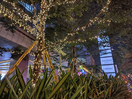 另外,再來看一組街拍的夜景拍照樣張。如下圖,整個(gè)畫面觀感非常不錯(cuò),放大后樹上的繞燈細(xì)節(jié)清晰可見,樹底下的盆栽植物、后邊的路牌、建筑大樓以及樹葉、畫面色彩都沒有丟失,該有的細(xì)節(jié)還是完整的保留下來,也不會(huì)出現(xiàn)畫面模糊,細(xì)節(jié)失真等現(xiàn)象。