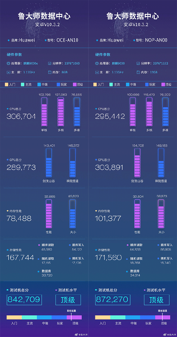 就在昨天知名跑分軟件魯大師放出了搭載麒麟9000E的華為Mate40的跑分成績,高達84萬分,魯大師表示麒麟9000E的CPU和麒麟9000沒有大的差別,屬于正常波動范圍,而少了倆核心的GPU弱了兩萬分左右。