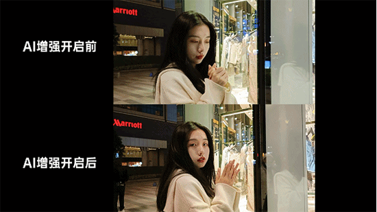 其次則是AI視頻增強(qiáng)功能。同樣是在視頻模式下,在上方的一列選項(xiàng)中,點(diǎn)擊“AI”圖標(biāo)即可開(kāi)啟AI視頻增強(qiáng)。通過(guò)以下的AI視頻增強(qiáng)開(kāi)啟前后的畫面對(duì)比來(lái)看,得益于夜景算法的加持,背景的光線亮度提升了一個(gè)檔次,而且小姐姐的臉部陰影也減弱不少,整體畫面也更為明亮,觀感更佳。