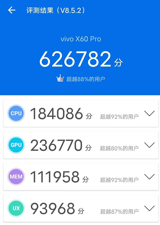 三星Exynos 1080在芯片架構上也采用了行業(yè)中先進的Cortex-A78 CPU及Mali-G78 GPU架構,為其性能體驗提供了堅實的基礎。在安兔兔跑分測試中,vivo X60 Pro取得了總分62.67W的優(yōu)秀成績,同時在3DMark的Sling Shot測試中取得了8891分的高分。這樣的性能表現(xiàn)完全可以滿足多樣化的應用需求,達到了2020年的主流旗艦水平。