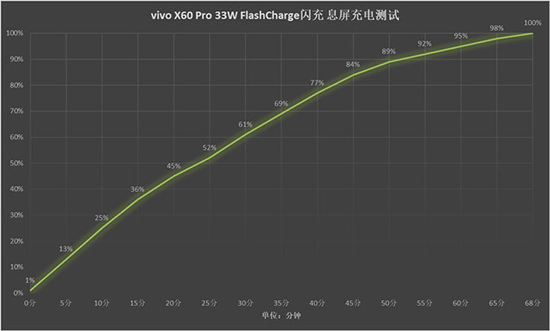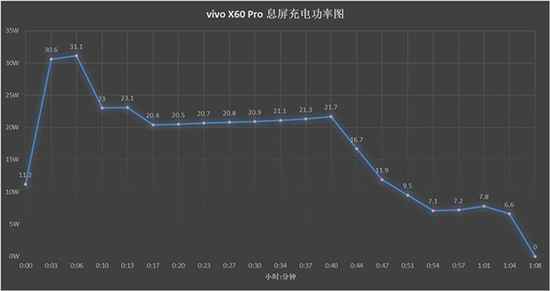 充電時間方面,vivo X60 Pro在息屏情況下耗時68分鐘從1%充到了100%,在電量到達100%之時充電功率隨即歸零,保證手機充電安全。