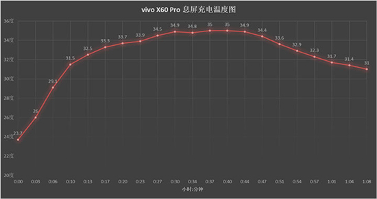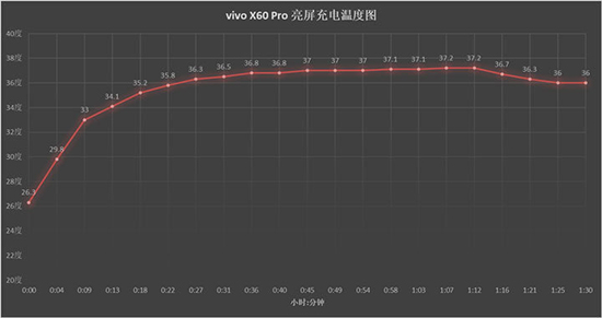 充電溫度方面,vivo X60 Pro在亮屏情況下溫度緩慢提升,峰值溫度37.2攝氏度。
